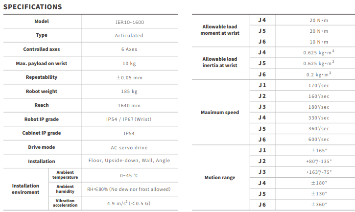 El IER10-1600 es un robot industrial articulado de 6 ejes de la marca IE-MAT, diseñado para aplicaciones de automatización industrial que requieren precisión, alcance extendido y versatilidad operativa. Este modelo ofrece una capacidad de carga máxima de 10 kg y un alcance de hasta 1640 mm, lo que permite cubrir amplias áreas de trabajo dentro de celdas productivas compactas.