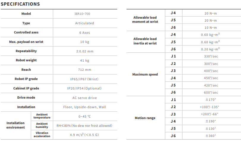 El IER10-700 es un robot industrial articulado de 6 ejes diseñado para aplicaciones de automatización industrial que requieren mayor capacidad de carga, precisión y confiabilidad en entornos productivos exigentes. Con una capacidad de carga máxima de 10 kg y un alcance de hasta 712 mm, este modelo ofrece un rendimiento equilibrado para procesos que demandan fuerza, estabilidad y flexibilidad operativa.