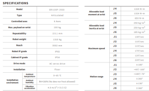El IER100P-3500 es un robot industrial articulado de 6 ejes de la marca IE-MAT, desarrollado bajo un diseño de plataforma modular, orientado a aplicaciones de automatización industrial de gran alcance que requieren alta capacidad de carga, acceso vertical profundo y elevada estabilidad operativa. Este modelo ofrece una capacidad de carga máxima de 100 kg y un alcance de hasta 3502 mm, permitiendo trabajar en zonas de difícil acceso dentro de equipos industriales de gran tamaño.
