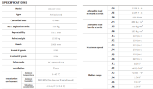 Alcanza una repetibilidad de ±0,1 mm, adecuada para operaciones industriales con cargas elevadas que requieren posicionamiento consistente. Cuenta con protección IP55 en el cuerpo del robot y protección IP54 en el gabinete, lo que permite su operación en entornos industriales exigentes. El accionamiento se realiza mediante servomotores AC, asegurando un control preciso y confiable. La instalación es en piso, optimizada para aplicaciones industriales de gran porte.