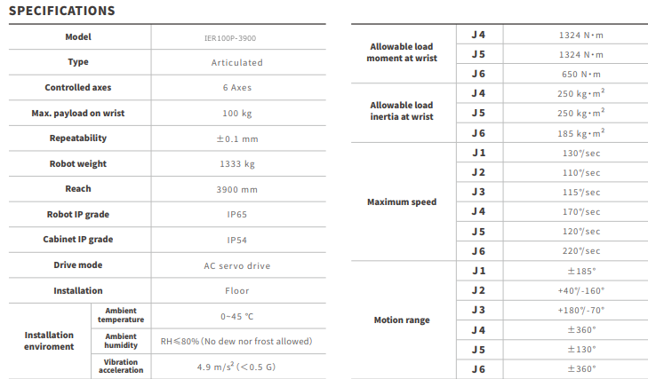 El IER100P-3900 es un robot industrial articulado de 6 ejes de la marca IE-MAT, desarrollado bajo un diseño de plataforma modular, orientado a aplicaciones de automatización industrial de gran alcance que requieren alta capacidad de carga, acceso vertical profundo y máxima estabilidad operativa. Este modelo ofrece una capacidad de carga máxima de 100 kg y un alcance de hasta 3900 mm, permitiendo operar en zonas de difícil acceso dentro de equipos industriales de gran tamaño.