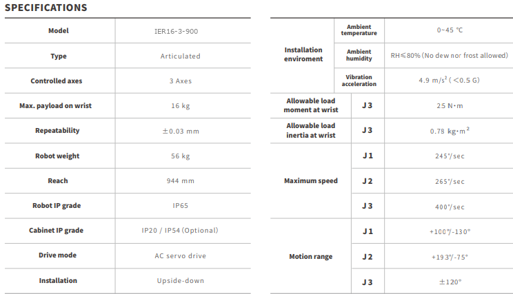 El IER16-3-900 es un robot industrial articulado de 3 ejes de la marca IE-MAT, diseñado para aplicaciones de automatización industrial enfocadas en operaciones de manipulación. Ofrece una capacidad de carga máxima de 16 kg y un alcance de hasta 944 mm, proporcionando una solución eficiente para procesos de handling en entornos industriales compactos.
