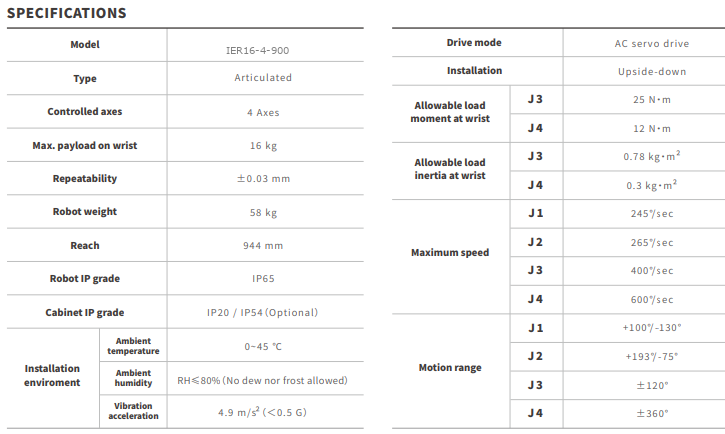 El IER16-4-900 es un robot industrial articulado de 4 ejes de la marca IE-MAT, desarrollado para aplicaciones de automatización industrial orientadas a operaciones de manipulación. Cuenta con una capacidad de carga máxima de 16 kg y un alcance de hasta 944 mm, ofreciendo una solución robusta y compacta para líneas productivas que requieren fiabilidad y eficiencia.