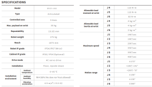 Cuenta con muñeca con protección IP67 y cuerpo del robot con protección IP54, lo que permite su operación en entornos industriales exigentes. Utiliza servomotores AC y admite instalación en piso e invertida (upside-down), facilitando su integración en distintas configuraciones de automatización industrial.