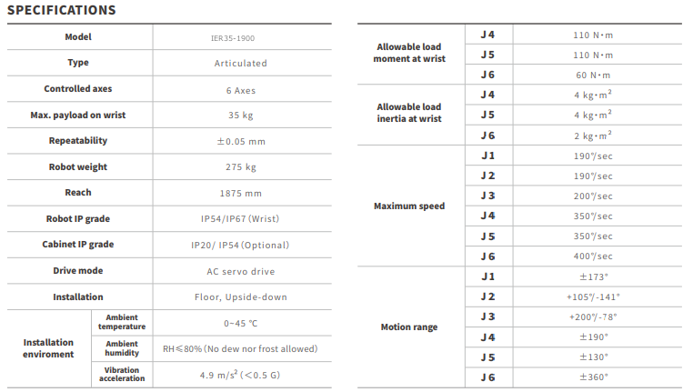 El IER35-1900 es un robot industrial articulado de 6 ejes de la marca IE-MAT, diseñado para aplicaciones de automatización industrial que requieren alta capacidad de carga, gran alcance y confiabilidad operativa. Este modelo ofrece una capacidad de carga máxima de 35 kg y un alcance de hasta 1875 mm, permitiendo cubrir amplias áreas de trabajo en procesos industriales exigentes.