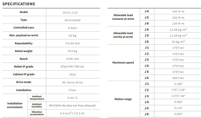 El IER50-2100 es un robot industrial articulado de 6 ejes de la marca IE-MAT, desarrollado para aplicaciones de automatización industrial de alta exigencia, donde se requiere gran capacidad de carga, alcance extendido y alto rendimiento operativo. Este modelo ofrece una capacidad de carga máxima de 50 kg y un alcance de hasta 2146 mm, permitiendo cubrir grandes áreas de trabajo en celdas industriales de gran escala.