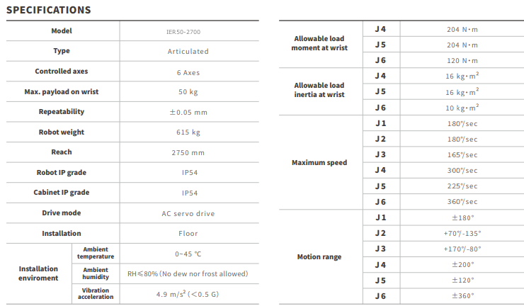 El IER50-2700 es un robot industrial articulado de 6 ejes de la marca IE-MAT, diseñado para aplicaciones de automatización industrial de gran escala que requieren alta capacidad de carga, alcance extendido y máximo rendimiento en procesos logísticos. Este modelo ofrece una capacidad de carga máxima de 50 kg y un alcance de hasta 2750 mm, permitiendo cubrir amplias áreas de trabajo en líneas productivas de alto volumen.