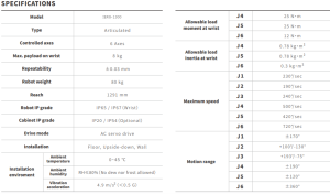 El robot presenta una repetibilidad de ±0,03 mm, resultado de un diseño que combina alta rigidez estructural y una construcción optimizada para mantener la estabilidad y exactitud del movimiento en procesos industriales continuos. Cuenta con grado de protección IP55 en el cuerpo del robot e IP67 en la muñeca, lo que facilita su operación en entornos industriales con presencia de polvo y condiciones exigentes. El accionamiento se realiza mediante servomotores AC, asegurando un control preciso y confiable.