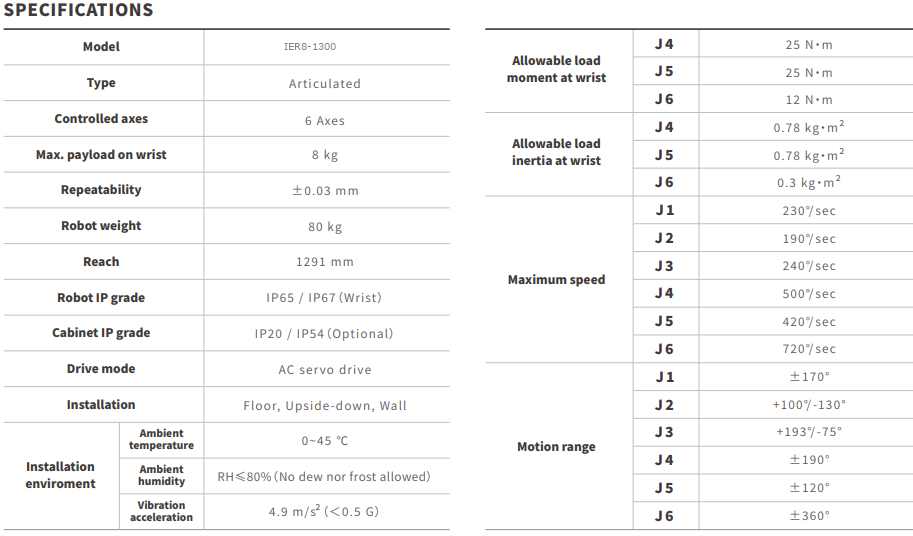 El IER8-1300 es un robot industrial articulado de 6 ejes de la marca IE-MAT, desarrollado para aplicaciones de automatización industrial que requieren precisión, flexibilidad y alcance extendido en entornos productivos compactos. Este modelo ofrece una capacidad de carga máxima de 8 kg y un alcance de hasta 1291 mm, permitiendo cubrir amplias áreas de trabajo dentro de celdas automatizadas.