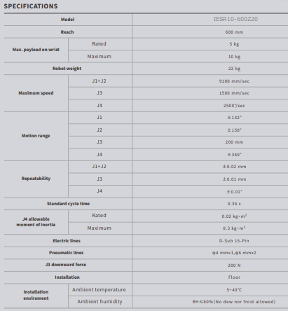 El IESR10-600Z20 es un robot industrial tipo SCARA de 4 ejes de IE-MAT, diseñado para aplicaciones de automatización industrial de alta velocidad que requieren mayor capacidad de carga sin comprometer precisión ni estabilidad. Dispone de un alcance de 600 mm y una capacidad de carga máxima de 10 kg, lo que lo hace adecuado para la manipulación de piezas más pesadas en procesos productivos exigentes.