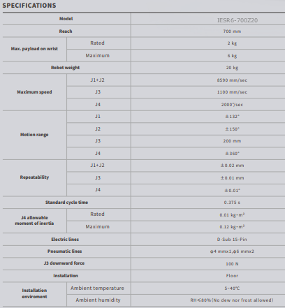 El IESR6-700Z20 es un robot industrial tipo SCARA de 4 ejes de IE-MAT, diseñado para aplicaciones de automatización industrial de alta velocidad que requieren mayor alcance operativo sin comprometer precisión ni estabilidad. Cuenta con un alcance de 700 mm y una capacidad de carga máxima de 6 kg, lo que lo hace adecuado para la manipulación de componentes de mayor tamaño dentro de ciclos productivos exigentes.