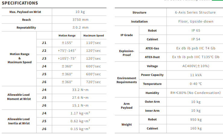 Cuenta con certificación antiexplosiva ATEX (China y UE), habilitando su uso en zonas con presencia de gases y polvo peligrosos. Presenta grado de protección IP65 para el robot e IP54 para el gabinete, adecuados para entornos industriales exigentes. Está orientado a la pintura de grandes piezas planas como puertas de madera, marcos de ventanas y tuberías, así como a la pintura de piezas irregulares de gran tamaño, como vehículos, siendo apto para sectores de mobiliario, automotriz y aplicaciones industriales de gran escala.