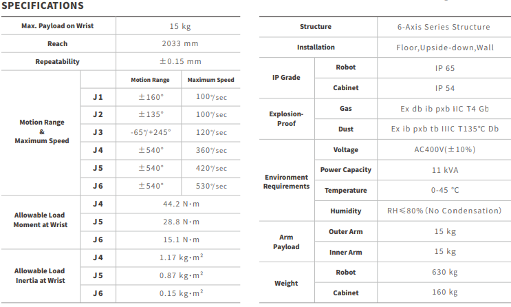 Cuenta con grado de protección IP65 para el robot e IP54 para el gabinete, y dispone de certificaciones antiexplosivas conforme a normativas de China, UE y ITTC, permitiendo su uso en atmósferas peligrosas con presencia de gases y polvo. Está orientado a pintura automotriz (interior y exterior) y de grandes piezas, y es apto para industrias como automotriz y autopartes, vehículos comerciales y especiales, vehículos de dos y tres ruedas, tránsito ferroviario, maquinaria de construcción, aeronáutica y naval.