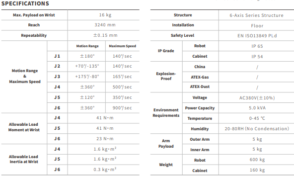 Su diseño incorpora una estructura de muñeca esférica ortogonal, que proporciona alta rigidez, mayor capacidad de carga y un amplio rango de trabajo, favoreciendo trayectorias estables y uniformes. El robot alcanza una repetibilidad de ±0,25 mm, adecuada para procesos de pintado de superficies extensas y piezas planas. Integra de serie software de aplicación de pintura y E/S incorporadas, lo que simplifica la programación y la integración en celdas automatizadas.